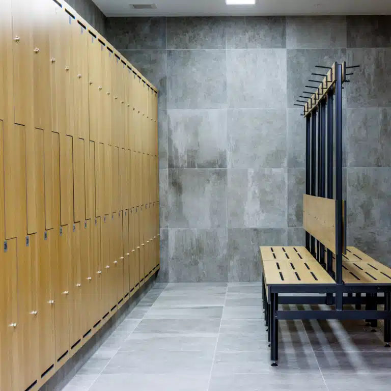 Seating in EOT facilities must combine comfort, durability, and smart storage. DuraCube offers shoe-box benches with purpose-built compartments to keep footwear organised and off the floor, as well as bench seating with coat rails or overhead shelving for added storage and convenience. Each configuration uses water-resistant materials designed for humid environments while maintaining a cohesive and modern aestheti