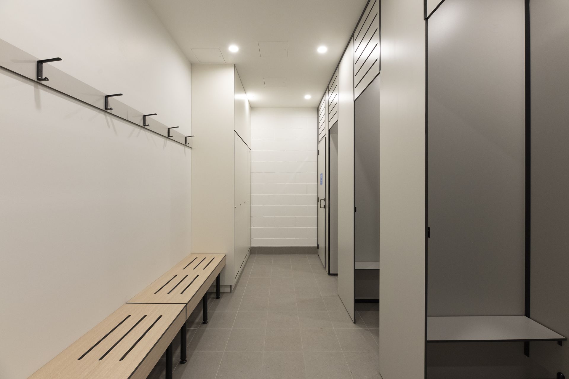 Plinth Mounted Lockers in DuraSafe 113 Off White were incorporated to create secure, low-maintenance storage zones that support daily sporting use without compromising the clean, modern look of the interiors.